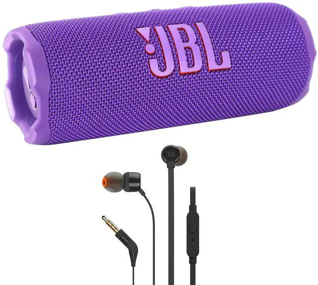 JBL FLIP 7 PORTABLE WATERPROOF BLUETOOTH WIRELESS SPEAKER (PURPLE) + JBL T110 IN EAR HEADPHONESJBL Flip 7 Portable Waterproof Bluetooth Speaker (Purple)The party starts whenever you arrived with the Flip 7 Portable Waterproof Bluetooth Speaker from JBL. The speaker's size and waterproof design makes it a great choice for the bedroom, backyard, or beach. The newly updated Flip now offers sound that's bigger and lasts longer. JBL's AI Sound Boost technology analyzes your music in real-time to deliver the best performance possible, and can now output up to 35W of sound. On a full charge, the Flip 7 can last for 14 hours, but Playtime Boost can be activated to squeeze out 2 additional hours if needed. Another new feature is Auracast support, which transmits audio to Auracast-enabled speakers in-range without the need for pairing; letting you add additional speakers for the biggest bashes.