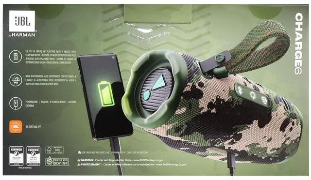 JBL cares about the environment as much as providing high-quality audio, which is why they use eco-friendly materials to make and package the Charge 6. Up to 85% of the Charge 6 is made from post-recycled plastic, and 100% of the fabric is recycled. The box it comes in uses FSC-certified paper packaging that's printed with soy ink. - JBL Portable App