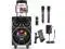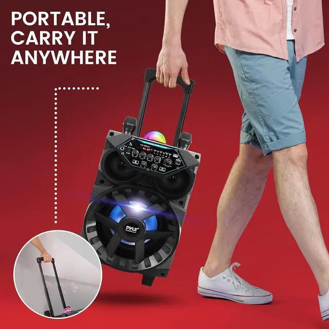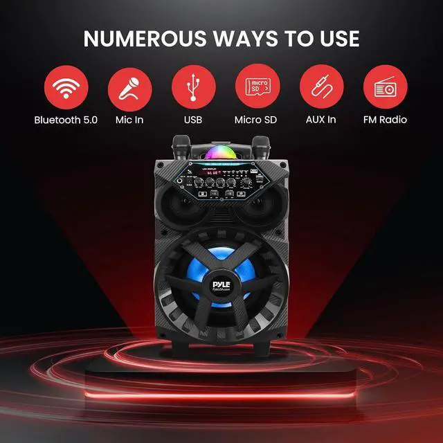 The Pyle PPHP86TBA Bluetooth Portable PA Speaker combines exceptional sound quality with striking visual effects. Featuring an 8" subwoofer and 1" tweeter, this system delivers a powerful 580W output for events, parties, and karaoke. With Bluetooth 5.0, enjoy seamless streaming from smartphones and tablets, while the USB and AUX inputs provide versatile playback options. Equipped with multi-color LED lights and a disco ball, it creates a dynamic party atmosphere. Designed for convenience, it includes two wireless microphones, a tablet stand, and a rechargeable battery with up to 3.5 hours of playtime.