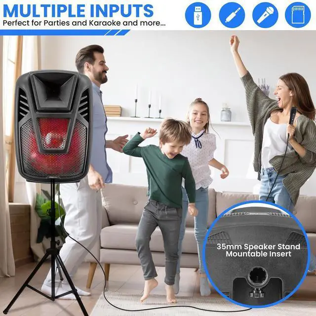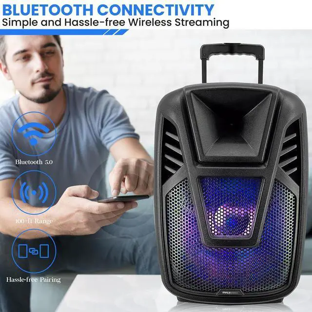 The Pyle 15" Portable Wireless Bluetooth PA Speaker System (PPHP1515AB) is your all-in-one audio solution for parties, karaoke, and events. Equipped with a 15" subwoofer and piezo tweeter, this powerful system delivers high-quality sound, while the Bluetooth 5.0 technology allows you to wirelessly stream music from your smartphone, tablet, or PC from up to 100+ feet away. The speaker also includes USB, Micro SD, AUX, and mic inputs, as well as FM radio, for endless music options. The LED light adds a fun atmosphere to any occasion.