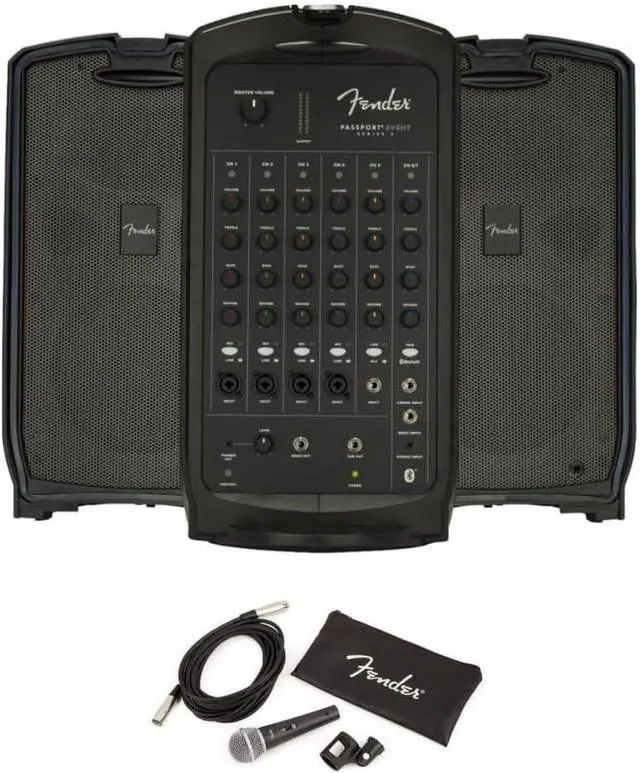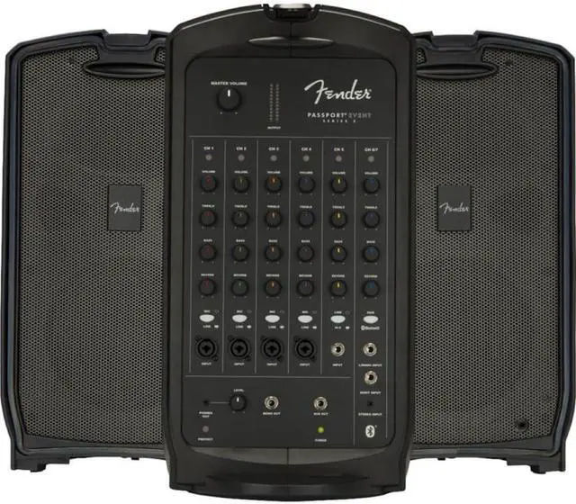 All-in-one PA system with seven-channel powered mixer and full-range speakers