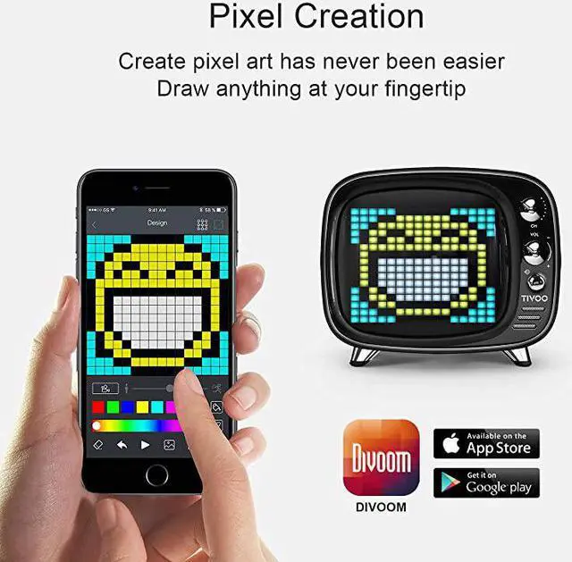 Color: BlackWHY SHOULD YOU CHOOSE TIVOO PIXEL Pixel Art DIY BLUETOOTH SPEAKER? > Retro and funky TV appearance, super strong function and classic pixel art, first-class sound quality, powerful bass. Tivoo is a great product and gift makes you have super awesome experience. DO YOU MISS THE OLD STYLE PIXEL ART? LOOK HERE! 16*16 pixel screen satisfied your creation. We got a pixel art community in our app, all of the people who are into pixel art having fun in here. We make images even animation and we show to others. HD SOUND QUALITY AND POWERFUL BASS! Top-level configuration and unique architecture brings you the best sound quality. Under 75 signal-to-noise ratio, powerful bass. V 5.0 blutooth, support aux & bluetooth & sd card. STOP BOTHERING FOR CHOOSING A GIFT. THIS IS YOUR BEST CHOICE. Are you still considering to buy a normal bluetooth speaker as a gift? Too boring! Tivoo bluestooth speaker, more than a speaker. And you will know it. A MUST-TO-BUY! JUST ADD TO CART NOW!!!