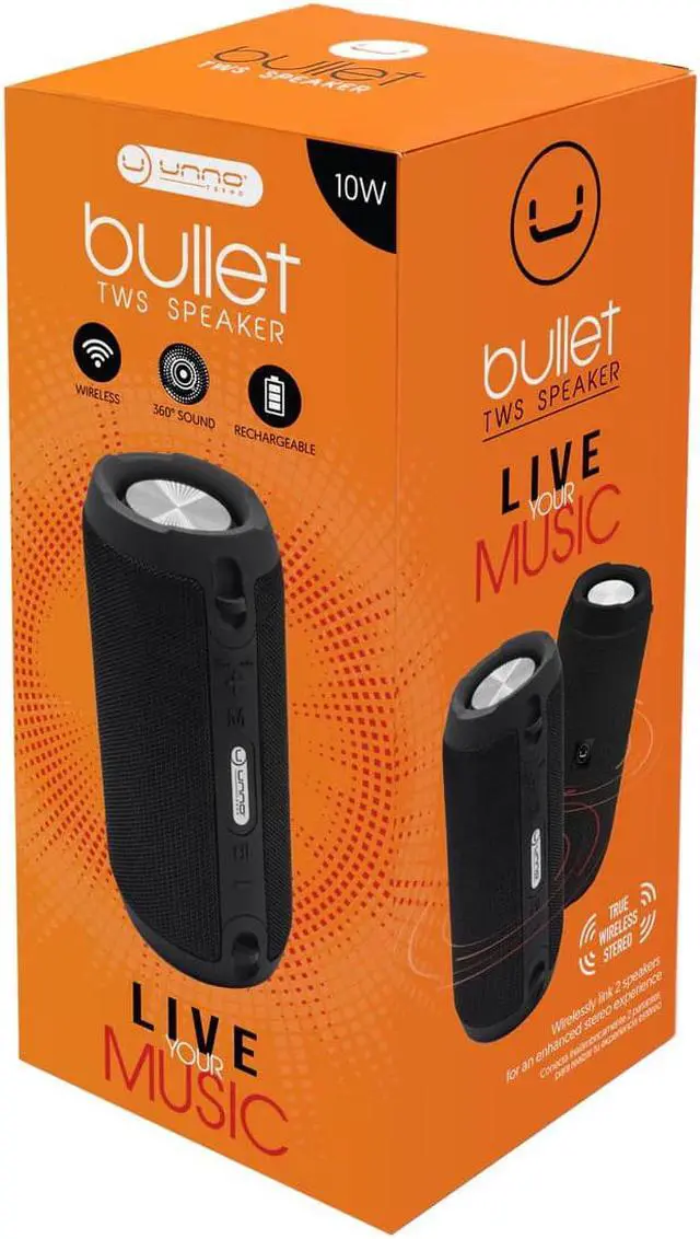 Take music wherever you go with the Bullet speaker. Its simple design allows it to be carried everywhere, it has powerful 360-degree sound and True Wireless Stereo (TWS) capability. Answer your calls with its hands-free feature, listen FM Radio or own favorite music from and SD Card.