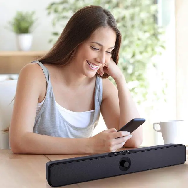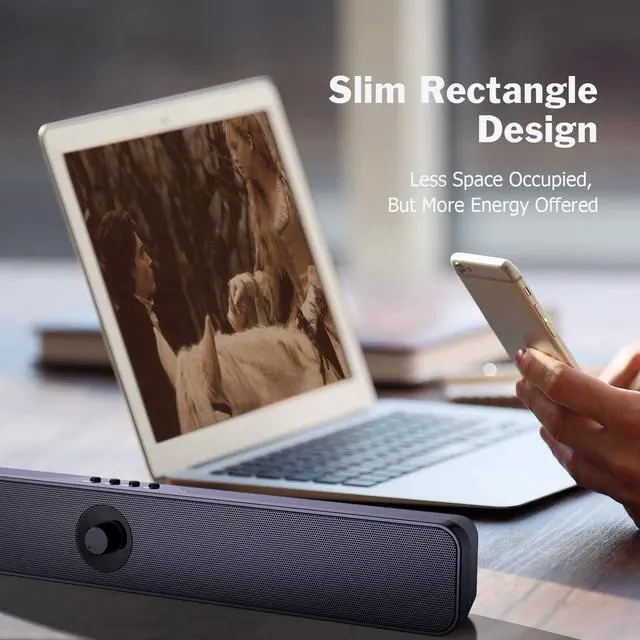 Unique Slim Design: Adopted a rectangular design with simple and clear lines, this mini soundbar (17.7 x 2.32 x 2.46 inches) greatly save desktop space, placed it under your monitor or behind your PC.