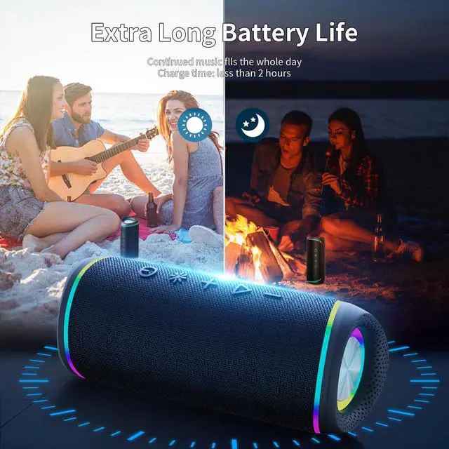 Experience Powerful Sound Anywhere, Anytime Whether you're relaxing at home, hosting a party, or heading outdoors, this wireless Bluetooth speaker delivers powerful stereo sound with deep bass and crisp highs. Built with dual drivers and advanced audio technology, it ensures clear, immersive audio with minimal distortionperfect for music, movies, gaming, and hands-free calls. 1. Immersive Stereo Pairing Enjoy even richer sound by pairing two speakers together via Bluetooth to create a true wireless stereo setup. Ideal for a full-room experience or outdoor gatherings. 2. Long Playtime & Seamless Connectivity With up to 20 hours of playtime at 50% volume (lights off), you can keep the music going all day. The speaker features Bluetooth 5.3, providing a stable connection up to 33 feet. Simply turn off the LED lights to extend battery life further. Kindly Note: Battery life may vary depending on usage and audio settings. 3. Rugged & Water-Resistant Design Designed with adventure in mind, this speaker is built with a rugged shell and carries an IPX5 waterproof rating, making it splashproof and perfect for the beach, poolside, camping, or hiking. Ready to handle daily drops, dust, and light rain. 4. Vibrant RGB Light Show Add excitement to any space with multi-color LED lights that pulse and change with your music. With one-touch control, you can easily customize light patterns to match your mood or event. 5. Versatile Features & Complete Package Built-in microphone for hands-free calls AUX input for wired connections (AUX cable not included) Compact yet powerful (Dimensions: 7.48" x 3.14" x 3.14"; Weight: 1.12 lbs) Type-C charging cable and Quick Start Guide included Package Includes 1 x Waterproof Bluetooth Speaker 1 x USB Type-C Charging Cable 1 x Quick Start Guide Safety Warning Please do not submerge the speaker in water. Avoid placing the speaker near open flames or direct heat sources. Use only with the provided charging cable. Instructions To pair, press and hold the power button until the Bluetooth light flashes. Search and connect via your device's Bluetooth menu. For stereo pairing, power on two speakers and double-press the pairing button on one of them. Perfect for Every Occasion Whether you're hosting a backyard BBQ, enjoying music during a workout, or looking for a cool gift idea, this speaker is a versatile and reliable choice. Backed by lifetime technical support, it's designed to keep your music going wherever life takes you.