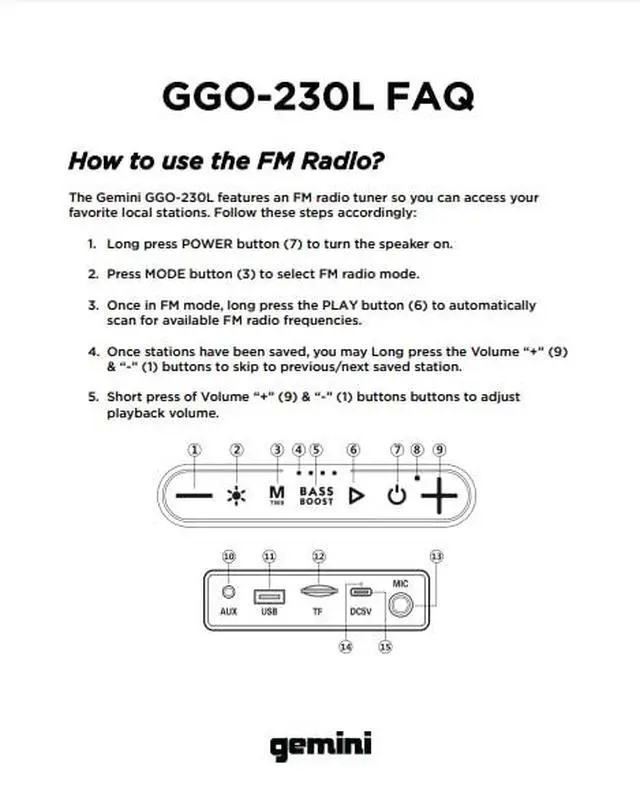 | Active/Passive | Active - The Gemini Sound GGO-230L is a party-starting 'Active' speaker, with a built-in amplifier. No extra equipment necessary, just a fun-loving attitude and your favorite tunes. Perfect for a spontaneous backyard jam or a beach bonfire! |