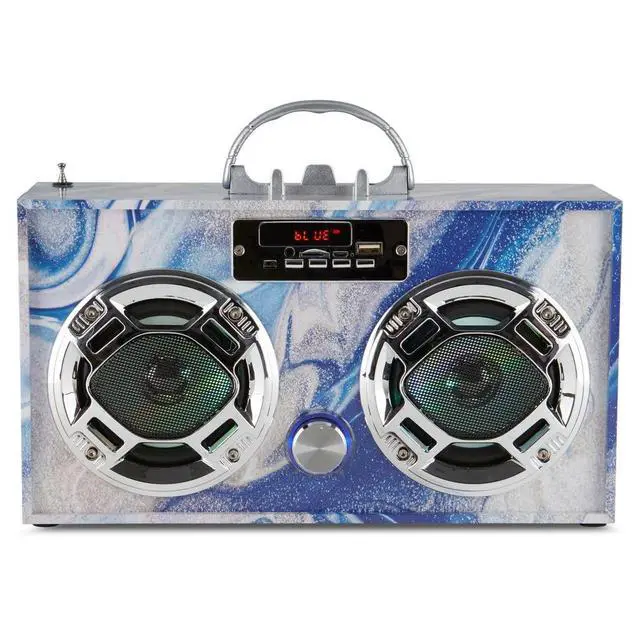 Wireless Express - Portable Party Speaker: Retro Boombox with Bluetooth, LED Light Show, Enhanced FM Radio, Rechargeable Battery (Blue Swirl)
