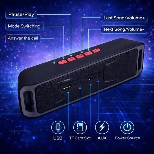 - Functions: TF CARD, BLUETOOTH, USB DRIVE, FM Radio, AUX INPUT