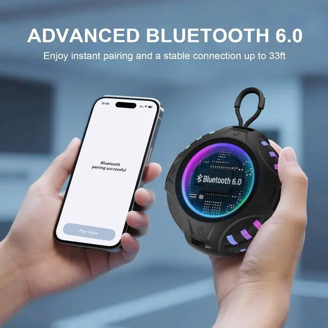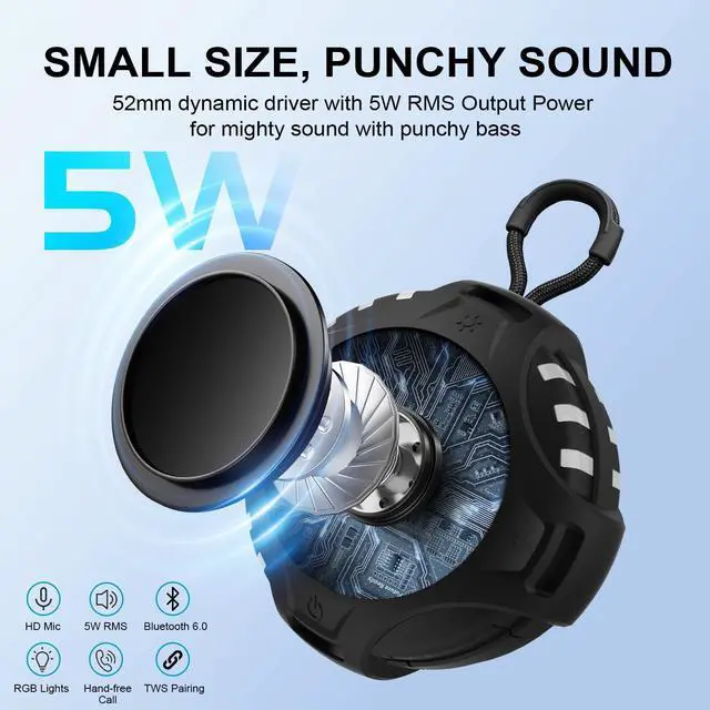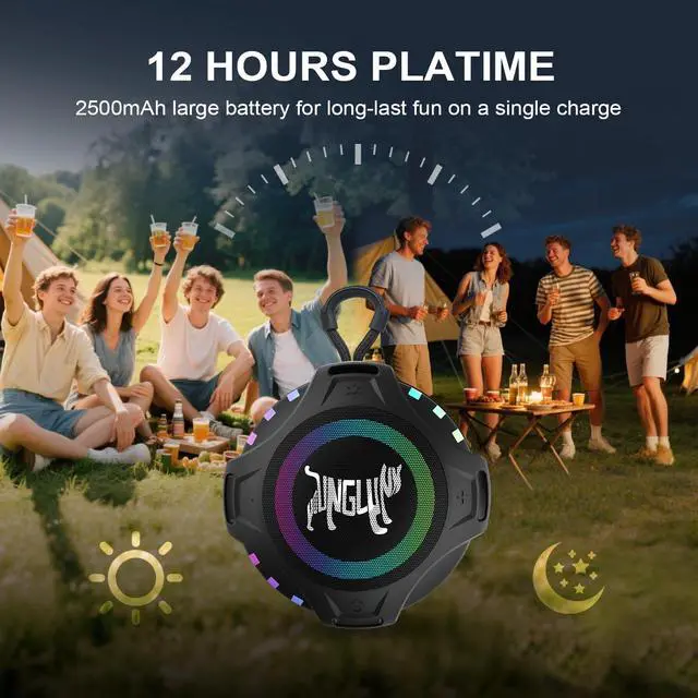 POWERFUL BATTERY - Fast USB-C recharge equipped with 2500mAh rechargeable battery, support for music playback long (determined by volume, led patterns and audio content of speaker played). Bluetooth 6.0 speaker is distortion-free at maximum volume 5W driver output for long-last fun, great for outdoors