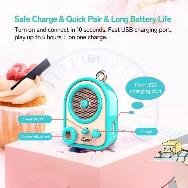 Bluetooth 5.0 & 6Hours+ Playtime: The cute bluetooth speaker sync with 5.0 Bluetooth and fast connect in 10 seconds. Micro USB charging is safe and fast, the portable bluetooth speakers can play up to 6+ hours on one charge.