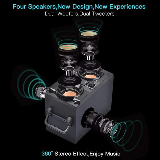 Powerful Bass Bluetooth Speakersdouble Bass and double tweetersA21 Bluetooth Speaker is a portable Bluetooth speaker, it have 4 loudspeakers including double Bass, double tweeters and a rear heavy bass guide tube. With this speaker, youll feel as if youre at a live concert, with clear high notes, deep bass and true HD sound. 60W Big power blueooth speaker can provide very powerful stereo and amazing bass sound. It will bring you an unprecedented listening experience.