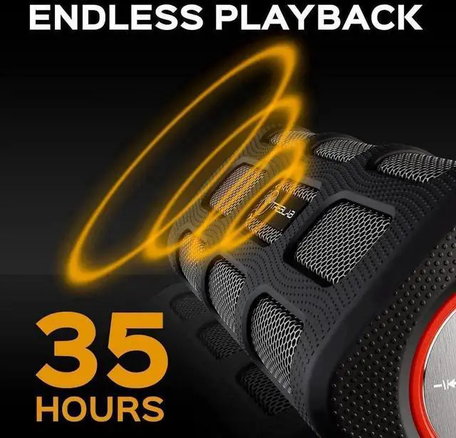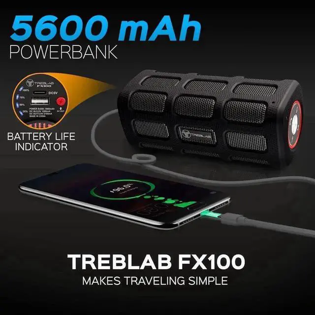 Endless playback Enjoy your favorite hits with the TREBLAB FX100 wireless Bluetooth speaker. Each portable speaker is built around a 5600 mAh powerbank with a battery life indicator. Up to 35 hour of playback per charge.