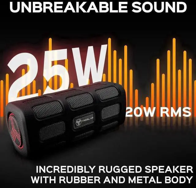 Durability done right Defy the elements with a dustproof, weatherproof, shockproof, and IPX7 waterproof travel speaker. TREBLABs outdoor wireless speakers are crafted from ultra-durable ABS, Metal, and Thermoplastic rubber, and compatible with any Bluetooth device.