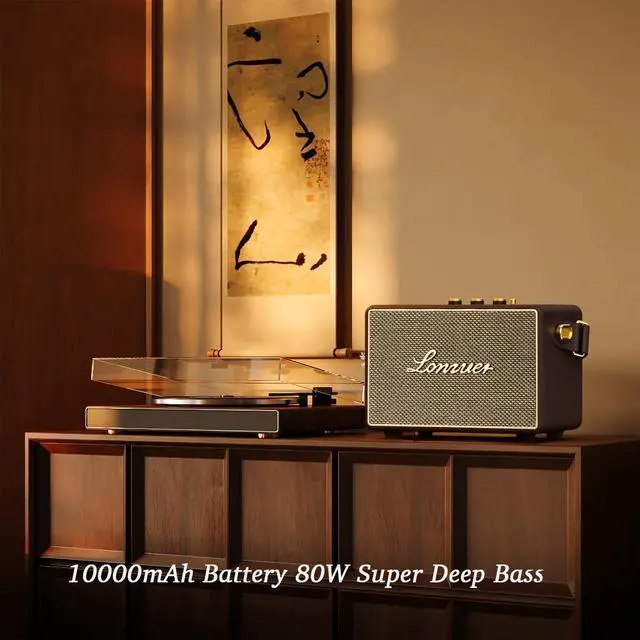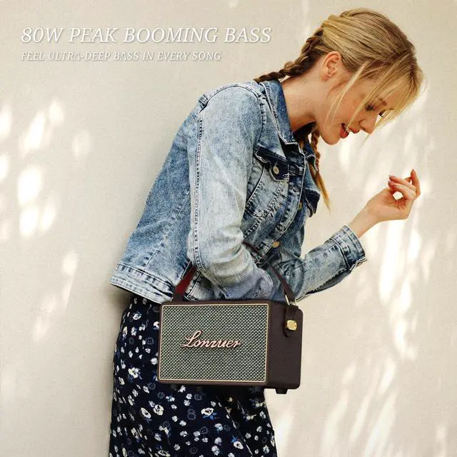 80W(PEAK)Stereo SoundThe retro bluetooth speaker have reasonable acoustic characteristics, sound quality is layered, the bass is strong and booming, the midrange is full and real, the treble is clear and loud.Whether you're listening to your favorite playlist, watching movies, our speaker guarantees an immersive audio experience