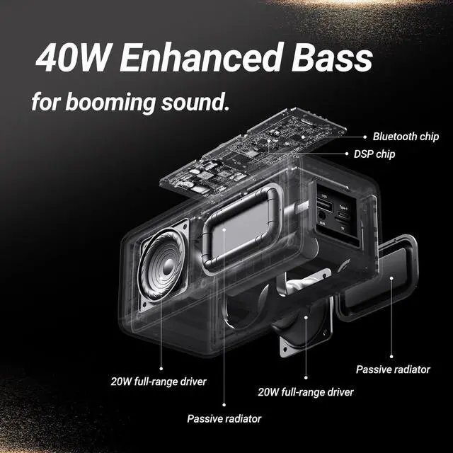 40W All-Around SoundM5 wireless bluetooth speaker is equipped with dual high-sensitivity drivers and dual passive radiators, pumping high-definition sound from all directions, bringing you an amazing 360° surround sound field, immersive Sound allows you have a deeper connection to your music. Simultaneously output BOGASING enhanced bass, get lost in the thundering bass, detailed mids, and crystal-clear highs.