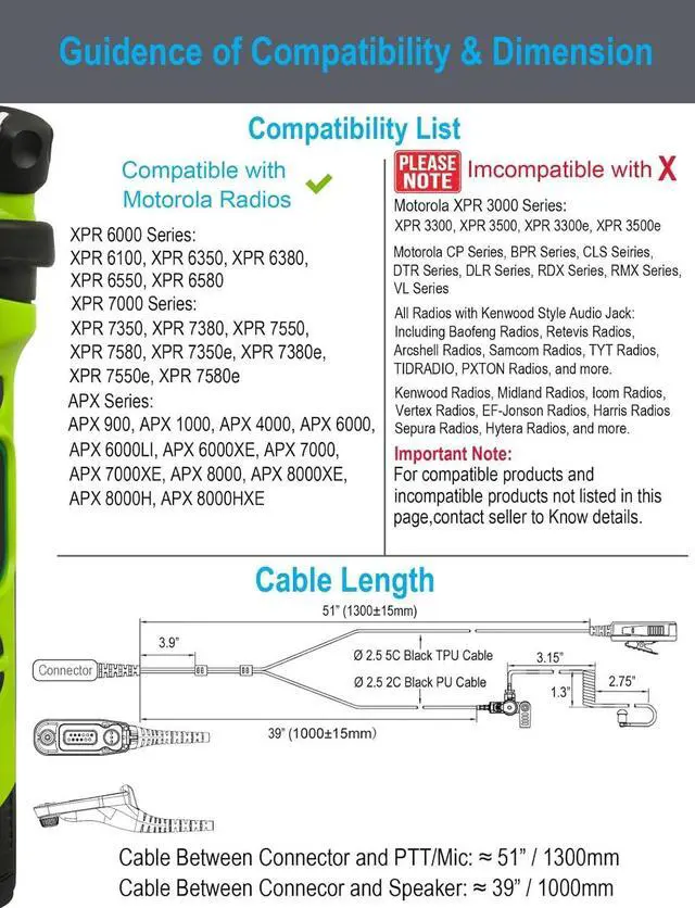 Warranty & Compatibility: 12 months worry-free warranty; Compatible with Motorola Radios APX 900, APX 1000, APX 4000, APX 6000, APX 6000LI, APX 6000XE, APX 7000, APX 7000XE, APX 8000, APX 8000XE, APX 8000H, APX 8000HXE, XPR 6100, XPR 6350, XPR 6550, XPR 6580, XPR 7350, XPR 7380, XPR 7550, XPR 7580, XPR 7350e, XPR 7380e, XPR 7550e, XPR 7580e and more.