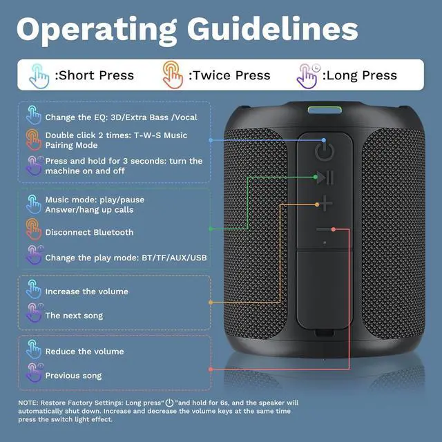 [RGB Colorful Light Effects] Get the party going with crystal-clear sound and vibrant, multi-color flashing lights. The speakers dual circular breathing lights automatically change colors in sync with the music, creating an immersive blend of sound and visuals. Want more control? Simply press the volume up and down buttons at the same time to turn the lighting effects on or off.