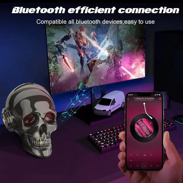 BLUETOOTH CONNECTION---- The bluetooth 4.0 technology with CSR8615 bluetooth module. This skull bluetooth speakers can easy connect to laptop, tablet, smart phones and cars via wireless bluetooth. Compatible with smartphones from every generation that has Bluetooth, offers you instantaneous connection and longer bluetooth connectivity range of 10 meters.