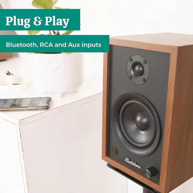 PLUG & PLAY POWERED BLUETOOTH SPEAKERS - Unbox, connect, relax. Conveniently connect to any source device through RCA, Aux-In, or Bluetooth 5 without needing additional components or complicated setups. Remote included.