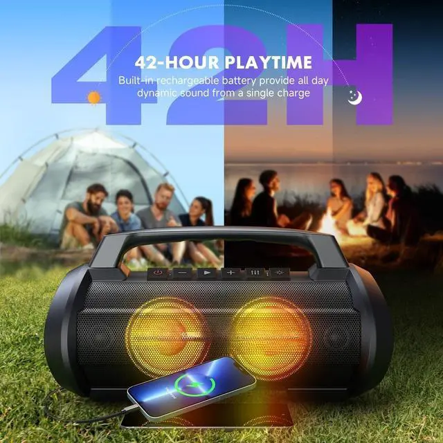 IPX6 WATERPROOF & 42H PLAYBACK & POWER BANK: The waterproof bluetooth speaker adopts an IPX6 waterproof and shockproof shell materials, rendering it impervious to the challenges of outdoor environments. The bluetooth speaker waterproof has a large battery to sustain 42H playback (minimum volume). The waterproof speaker can be as a power bank to recharge a array of smart devices, sparing you from the inconvenience of missed communication. The bluetooth speakers are ideal for beach, pool, travel