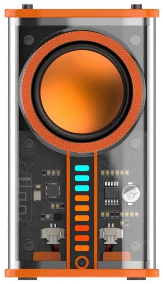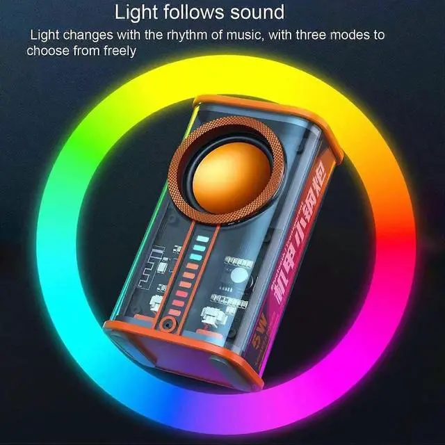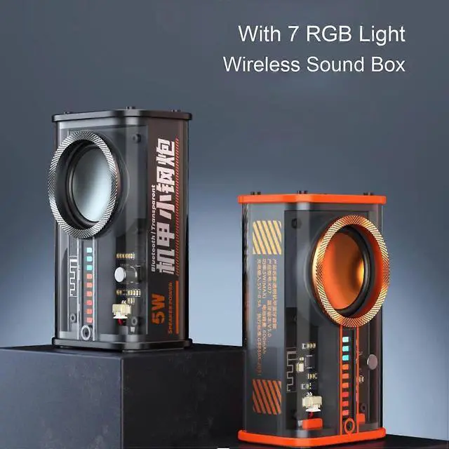 Elevate your audio experience with this transparent mecha-style Bluetooth speaker, featuring dazzling 7-color RGB lights and powerful sound.