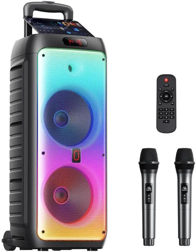Dual Microphones: Includes two anti-howling wireless microphones with a 20-meter range, plus an additional 6.35mm mic input for expanded karaoke fun.
