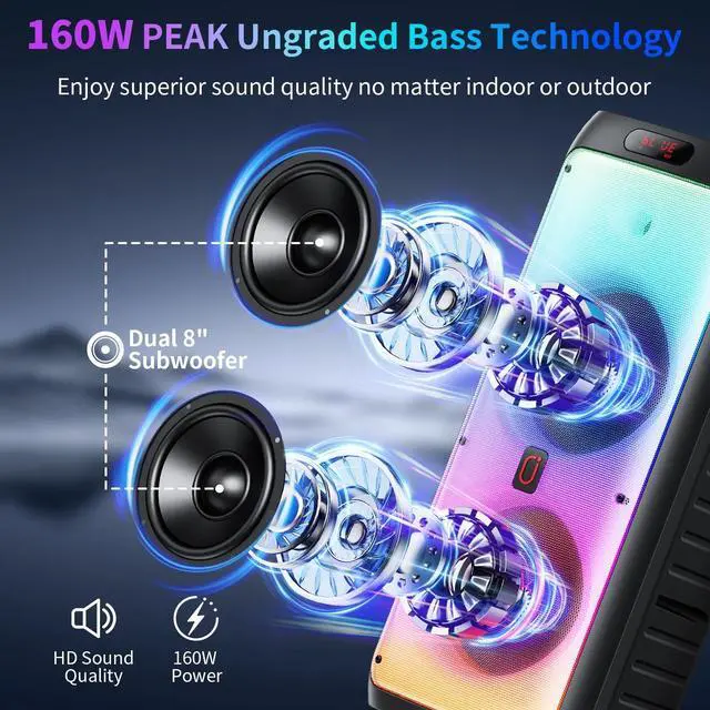 Powerful Audio: Delivers crystal-clear audio with deep bass from dual 8-inch woofers, providing rich, distortion-free stereo sound for various gatherings.