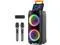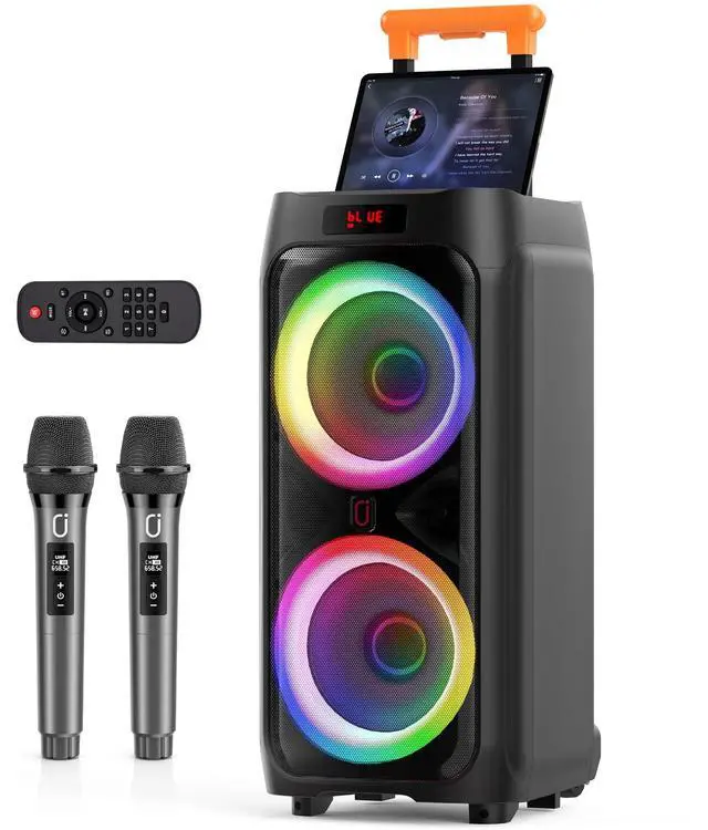 Convenient Accessories: Includes a top groove for holding phones/tablets, two wireless microphones, and a remote control for hands-free operation and karaoke.
