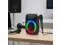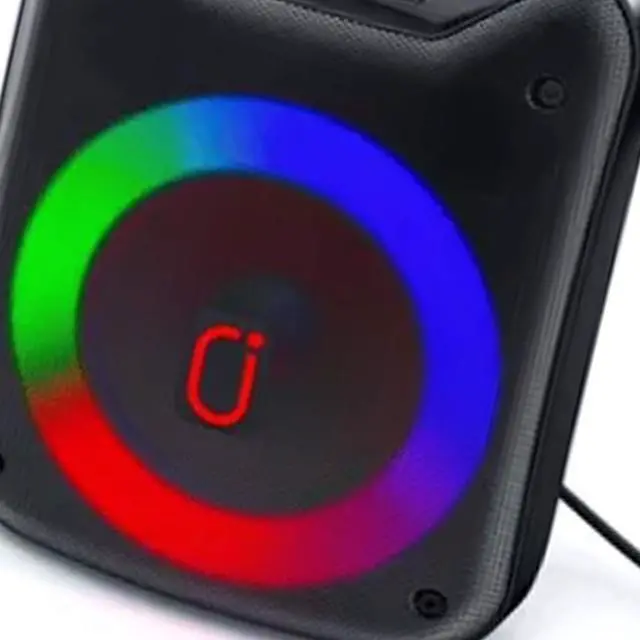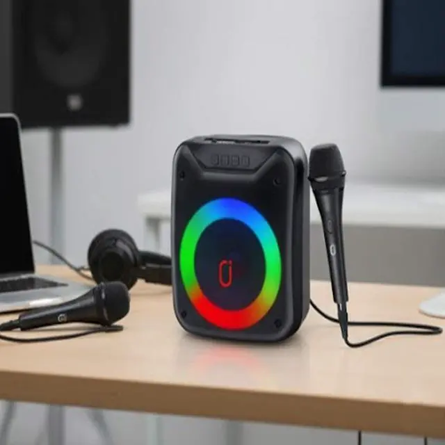 Bring music and karaoke fun anywhere with this portable Bluetooth speaker system featuring crystal clear sound and vibrant RGB LED lights. Compact and lightweight at just 1.8 lbs, it provides 58 hours of uninterrupted playback even at maximum volume. Two microphone jacks allow duets or group singing, making it perfect for indoor and outdoor gatherings. Versatile connectivity options include Bluetooth and USB, while the built-in LED light show adds a festive touch. Refurbished to like new condition and sanitized to meet manufacturer quality standards, this speaker is ideal for parties, karaoke sessions, and casual music enjoyment.