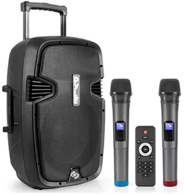 Bring powerful sound to any event with this 1000W active wireless Bluetooth outdoor speaker, perfect for parties, karaoke, and public gatherings. This complete PA system includes dual UHF wireless microphones, remote control, and all necessary cables, making setup simple and efficient. Equipped with rolling wheels and a convenient handle, its easy to transport for indoor or outdoor use. Brand new in unopened original packaging, this speaker delivers clear, amplified audio for crowd control, entertainment, or music performances.
