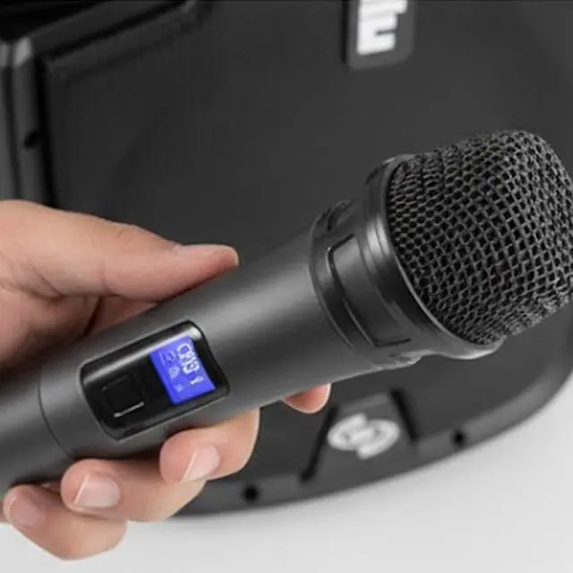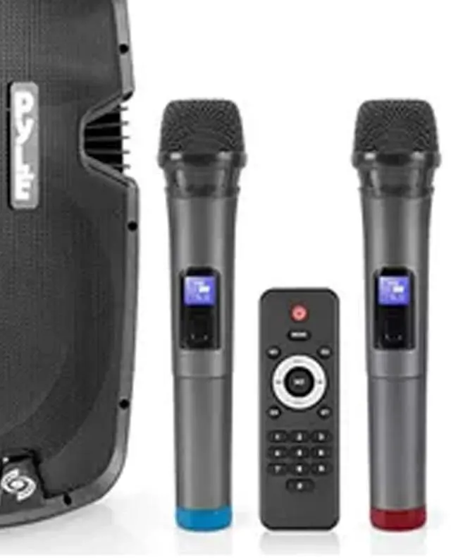 Microphones: Two UHF wireless microphones included for karaoke or announcements