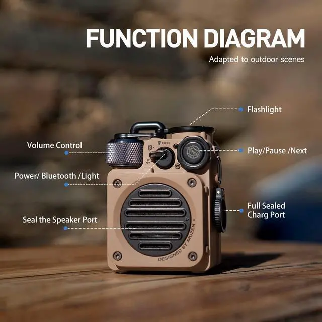 3 Outdoor Flashlight ModeMuzen Wild Mini waterproof bluetooth speaker is protected against water from any direction. It is your new beach or pool party essential that can survive at sand and surf while delivering a powerful listening experience. With 3 modes of lighting including High, Low and SOS flashlight, the wearable flashlight speaker helps keep you safe on dark forest trails and guides your way back to camp
