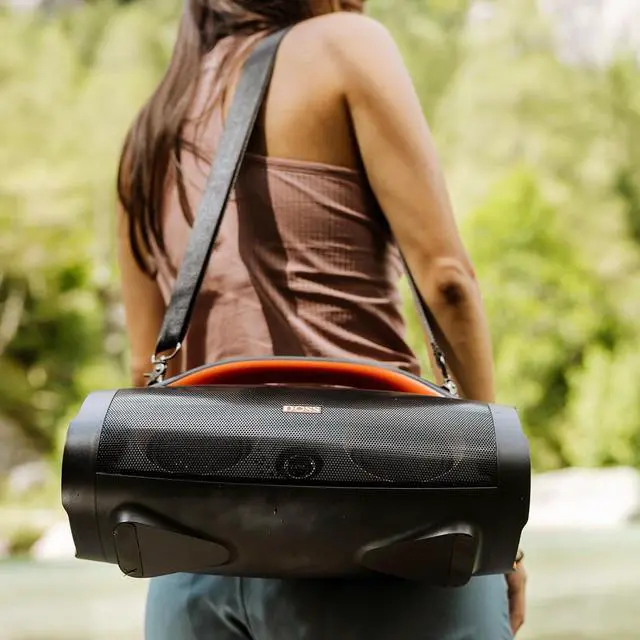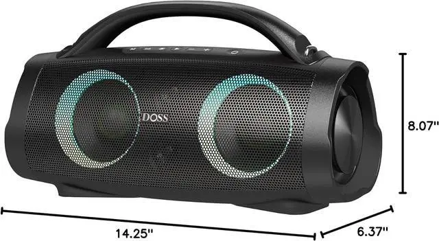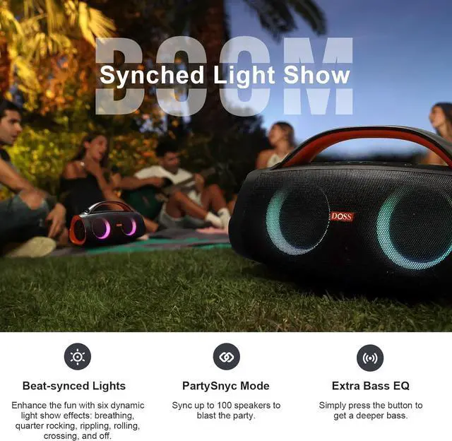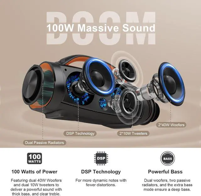 Powerful Sound: Dual 40W Woofers, dual 10W tweeters, two passive radiators, and two DSP technologies are designed to deliver a powerful full-range sound, thick bass, and clear treble with less distortion. Immerse yourself in a giant party with 100W of booming sound on our most powerful portable DOSS Extreme Boom+ speaker.