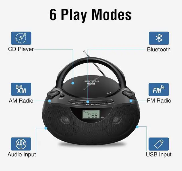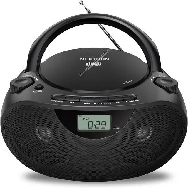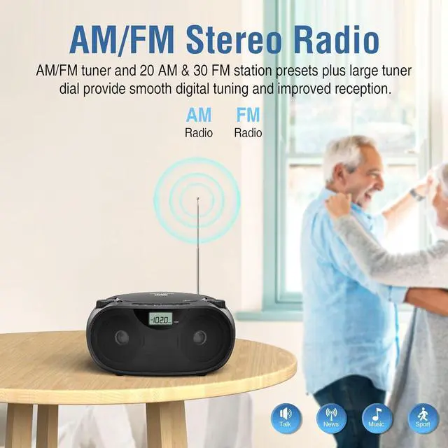 Convenient Playback Features Includes shuffle, repeat, and program playback modes, resume function, LCD display, and large volume and tuning dials for simple operation.