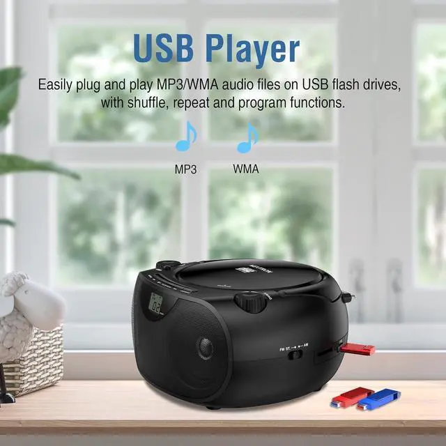 Top-Loading CD Player Plays standard CDs, CD-R/RW discs, audiobook CDs, and MP3/WMA audio files, offering flexible playback for both classic albums and custom recordings.