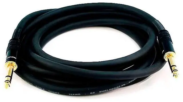 This cable features TRS/stereo plugs on each end. It uses 16 AWG stranded, pure copper conductors and employs copper braid shielding with 97.5 % coverage.