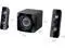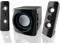 3 speakers: left, right, and subwoofer with wooden speaker enclosure