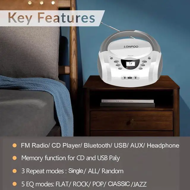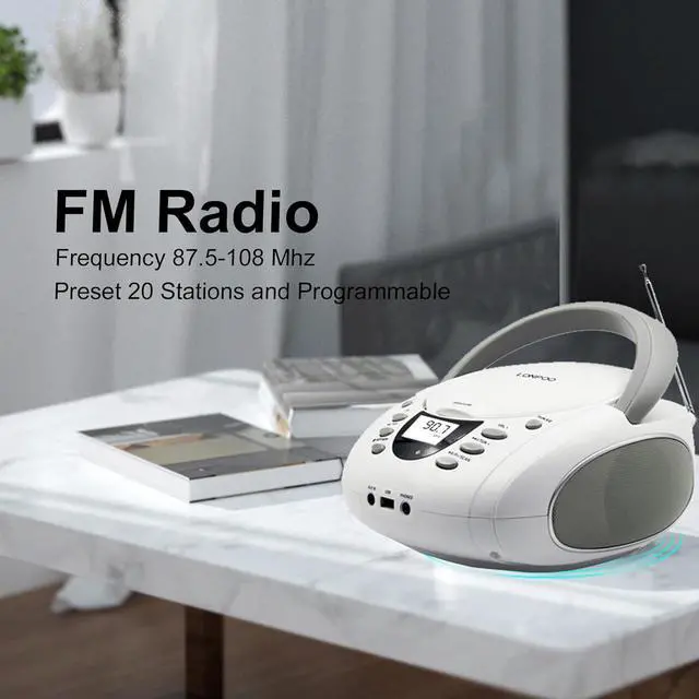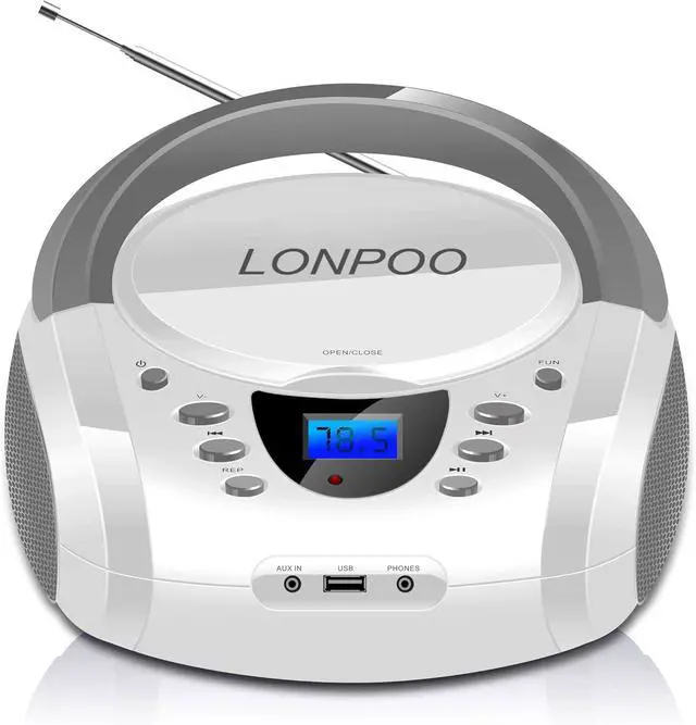 LONPOO CD Players Portable Boombox with FM Radio/USB/Bluetooth/AUX Input and Earphone Jack Output, Stereo Sound Speaker & Audio Player,White