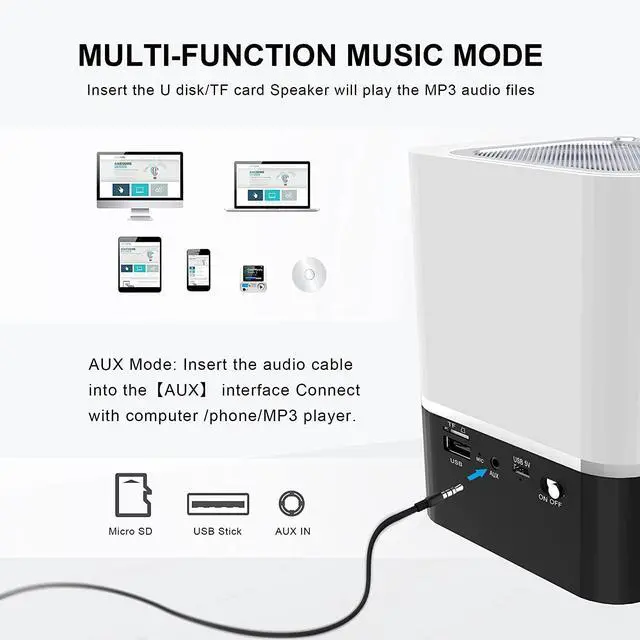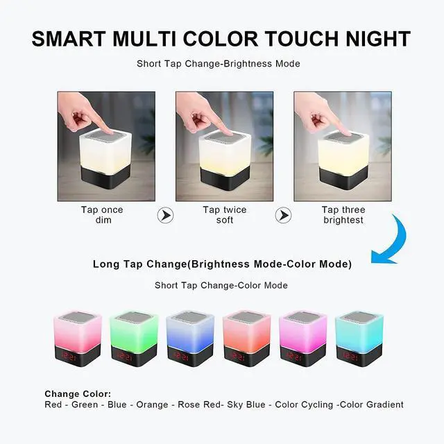 Upgraded 6 in 1 MultifuctionalBluetooth speaker+Touch Sensor Led lamp+Alarm Clock+MP3 player+Hand Free Call+Radio. All in 1! Can also be use as MP3 Player with USB and micro TF/SD Card input, AUX input and flash drive.