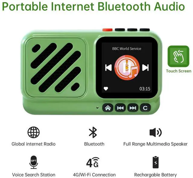 Unlock the world of sound and experience the next generation of innovation Enhance your audio experience with a touchscreen Bluetooth Radio that combines vintage charm with cutting-edge technology. Designed for music lovers and radio fans, this Radio blends high-fidelity sound quality with smart features to enrich every moment. Key Features: - Bluetooth 5.3 and touchscreen interface: easily connect your devices with silky smooth touch response for easy playlist browsing. - Global Radio Access: Explore more than 40,000 radio stations across continents and 10 million podcasts, all presented in crystal clear quality. - AI Voice Control: Use natural language commands through GPT integration to play specific content without consulting the catalog. - Convenient for traveling: lightweight body and compact size fits in a backpack