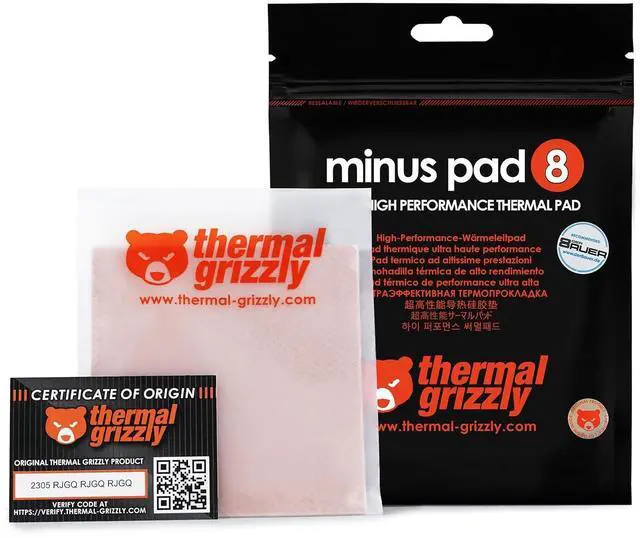 - The high performance thermal pads of the Thermal Grizzly Minus Pad series consist of a very elastic and flexible surface area with very high thermal conductivity, compensating for even the smallest of gaps between components.