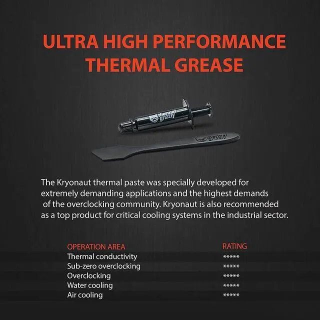 It can work with almost any system either with air or with liquid nitrogen (down to -250 °C). Thermal Grizzly Kryonaut is a recommended heatsink thermal paste for CPU applications that require high thermal conductivity at room temperature e. g. between a silicon chip PC microprocessor and heat sink. It comes with a thermal paste spreader.