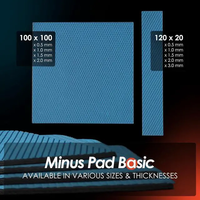 The electrically non-conductive Minus Pad Basic thermal pads are based on the proven Minus Pad 8 and have been optimized for improved thermal conductivity and compressibility. They are suitable for SSDs, graphics card coolers, GPU water coolers, and electronic components.