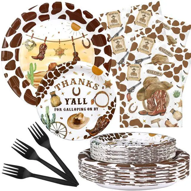 Serves 20 Complete Set Saddle up for the perfect celebration with this western cowboy party supplies kit, curated for 20 guests. It includes dinner plates, "Thanks Y'all" dessert plates, rustic napkins, and heavy-duty black forks. Everything you need for a seamless rodeo-themed feast in one convenient pack.