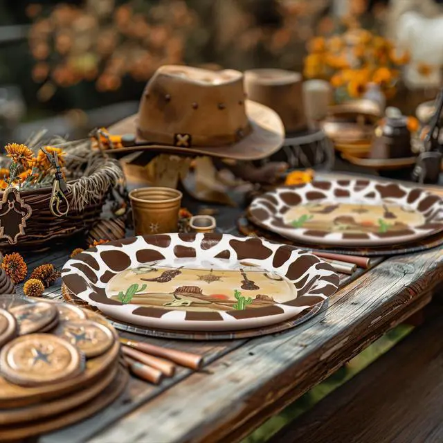 Authentic Western Design Featuring classic brown cow print borders, desert landscapes, cowboy boots, and "Wanted" posters. Our cowboy plates and napkins are designed to bring the spirit of the frontier to life, making these decorations the highlight of your wild west table setting.