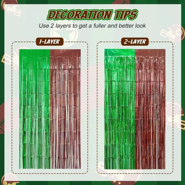 WIDELY APPLICATIONS: These dark green and brown foil fringe curtains backdrop also are perfect for football live streamer backdrop, sports broadcast streamer backdrop, sports party photo backdrop, stage backdrop, disco backdrop, bar backdrop decoration, etc.