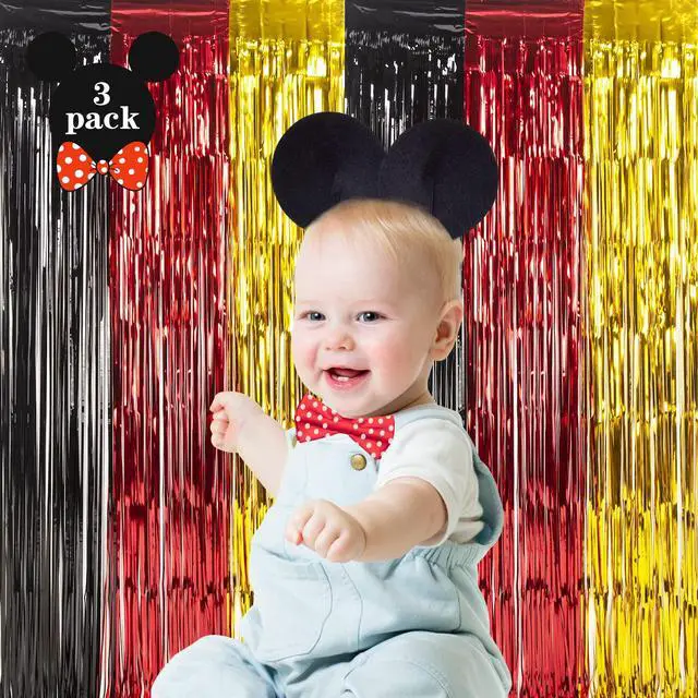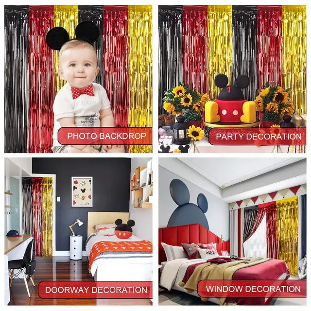 CARTOON MOUSE PARTY SUPPLIES: 3 packs of red, black, and gold foil fringe curtains, large size (width x drop) 79.2 x 39.6 x 0.01 inches each, perfect for cartoon mouse party decoration. Our colorful foil fringe curtains will let your kids feel the cartoon atmosphere at their birthday party.