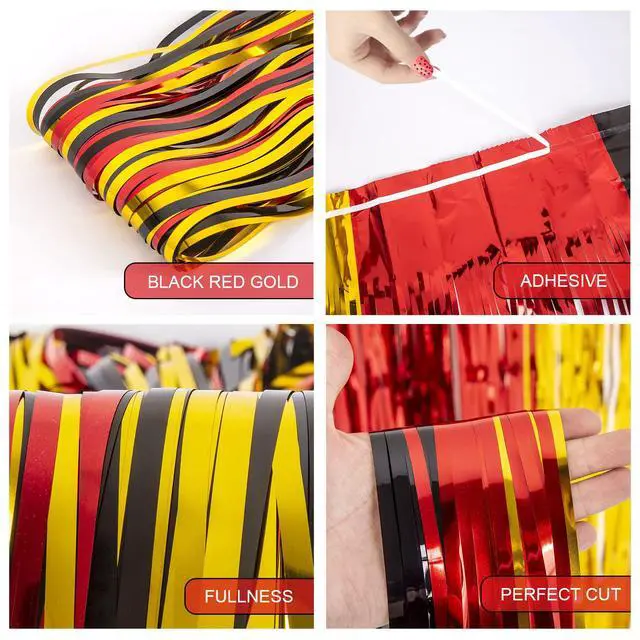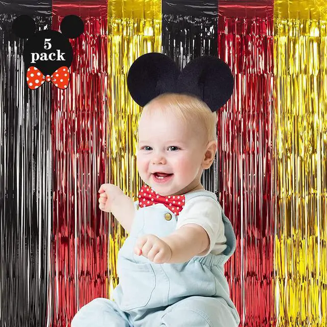 CARTOON MOUSE BIRTHDAY PARTY SUPPLIES: 5 packs of red, black, and gold foil fringe curtains, each measuring 1 x 1 x 1 inches, perfect for cartoon mouse party decoration. Our colorful foil fringe curtains will help create a fun atmosphere for your kids' birthday party.