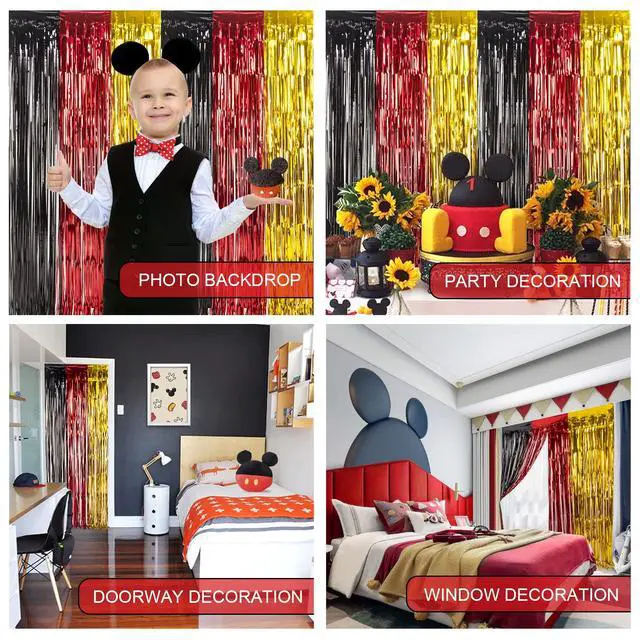 CARTOON MOUSE PHOTO BOOTH PROP BACKDROP: Our cartoon mouse-themed red, black, and gold tinsel foil fringe curtains make an excellent photo backdrop for kids during birthday party decorations. Youll be delighted by the vibrant atmosphere they create.