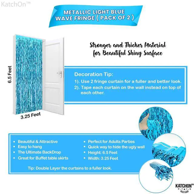 XTRALARGE SIZE | PACK OF 2, WAVY BLUE FRINGE: Introducing the Wavy BLUE Foil Fringe Curtain with Sparkle, a stunning decorative piece that will add a touch of elegance to summer party decorations. Let them be amazed with this Pack of 2, BLUE fringe backdrops of size 78 x 38.4 x 0.04 inches. The wavy design of this blue streamers will create a shimmering effect for under the sea party decorations, beach party decorations, ocean party decorations, and bridal shower decorations.